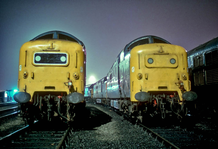 On the evening of 17th March 1980 55008 (D9008) "THE GREEN HOWARDS" is seen with 55011 (D9011) "THE ROYAL NORTHUMBERLAND FUSILIERS", whilst 55021 (D9021) "ARGYLL & SUTHERLAND HIGHLANDER" lies behind, at York TMD.