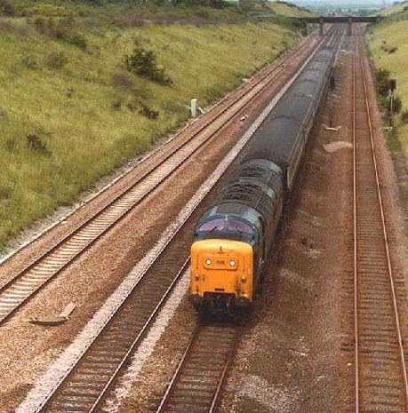 Working the summer Saturdays 1A37 08:47 Bridlington - King's Cross service on the 13th June 1981 is 55015 (D9015) "TULYAR" seen as it passes Abbots Ripton, north of Huntingdon. 55015 had worked forward from York replacing 55014 (D9014) "THE DUKE OF WELLINGTON'S REGIMENT".