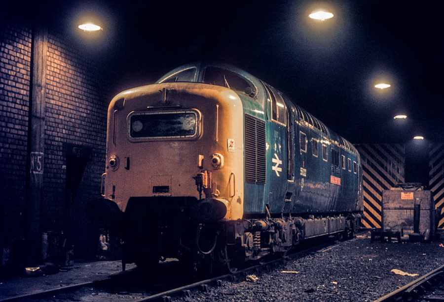 Following completion of a 'D' examination 55022 (D9000) "ROYAL SCOTS GREY" sits in front of York TMD on the 13th November 1980, its next move would be to Thornaby TMD for tyre turning.