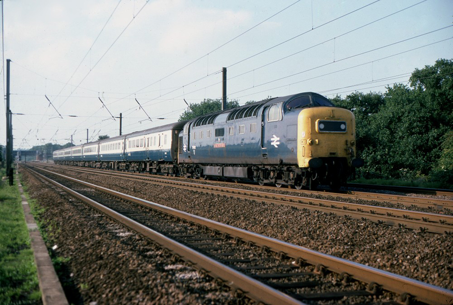 On what is thought to be the Sunday 1A10 14:56 York - King's Cross service 55022 (D9000) "ROYAL SCOTS GREY" passes Brookman's Park on the 16th July 1978.